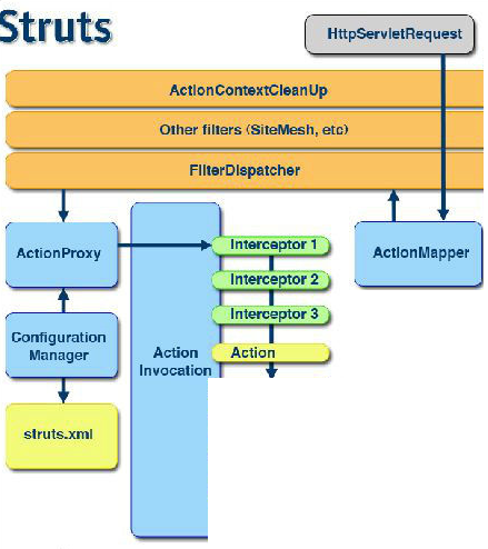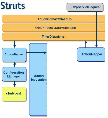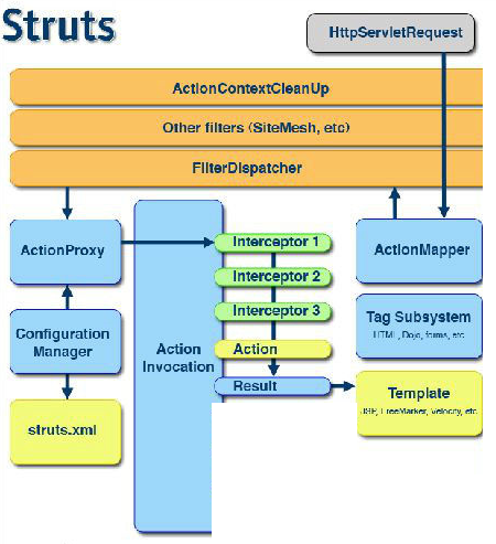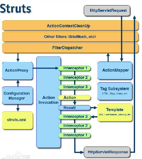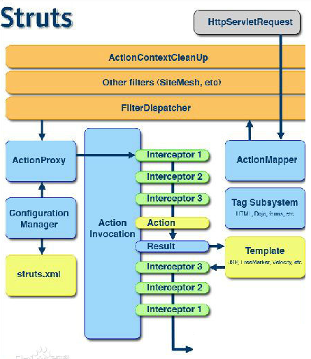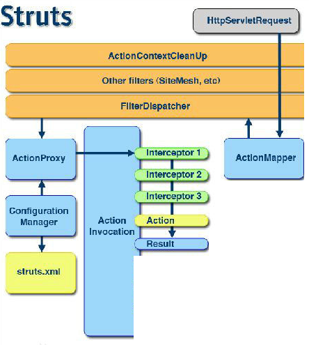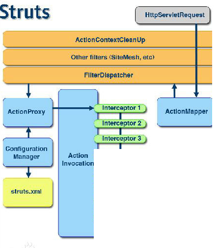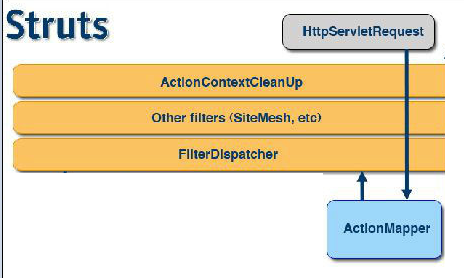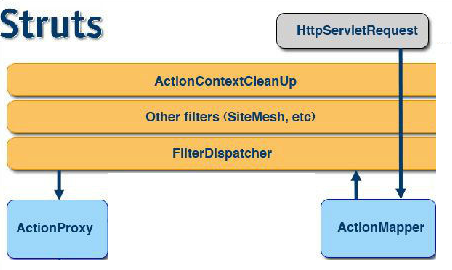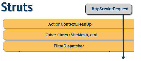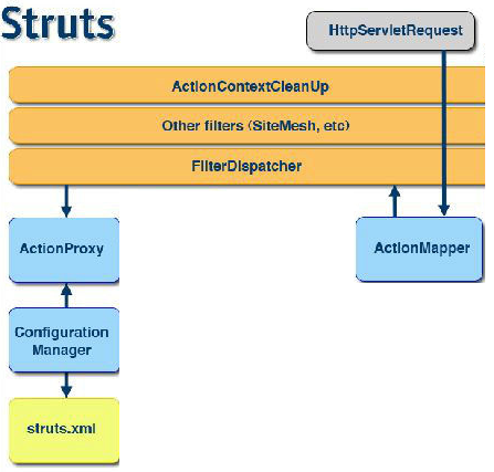 注:FilterDispatcher是任何一个Struts2应用都需要配置的,一般出现在过滤器的最后;如果在FilterDispatcher钱出现了如SiteMesh这种特殊的过滤器,还必须在SiteMesh前边应用Struts2的ActionContextCleanUp过滤器。