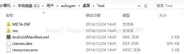 (6)在上一步中,我们已经生成了一个签名的apk文件Test.apk然后我们使用解压软件,解压,