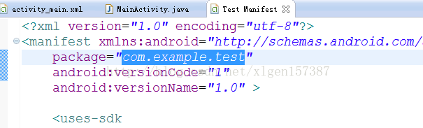 这里的com.example.test是在,项目目录下的AndroidManifest.xml文件中,因此我们可以修改他的文件名称