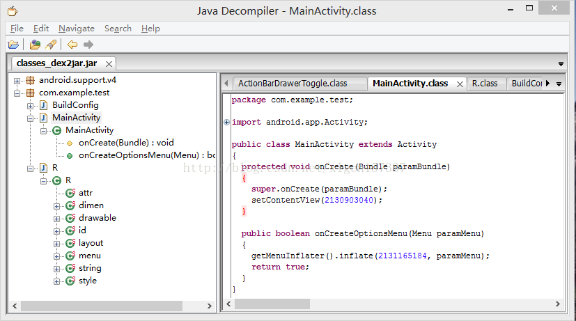 (14)然后将生成的class_dex2jar.jar文件拖入到第二个工具JD-GUI中,就可以看到了
