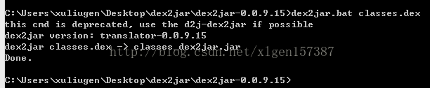 (12)然后执行dex2jar.bat 后边加上刚才拷贝的要反编译的文件calsses.dex