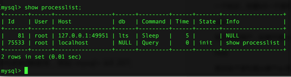 当感觉mysql性能出现问题时,通常会先看下当前mysql的执行状态,使用 show processlist 来查看,例如: