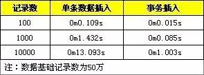 这里也提供了测试对比,分别是不使用事务与使用事务在记录数为1百、1千、1万的情况。