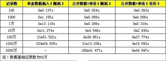 从测试结果可以看到,合并数据+事务的方法在较小数据量时,性能提高是很明显的,数据量较大时(1千万以上),性能会急剧下降,这是由于此时数据量超过了innodb_buffer的容量,每次定位索引涉及较多的磁盘读写操作,性能下降较快。而使用合并数据+事务+有序数据的方式在数据量达到千万级以上表现依旧是良好,在数据量较大时,有序数据索引定位较为方便,不需要频繁对磁盘进行读写操作,所以可以维持较高的性能。
