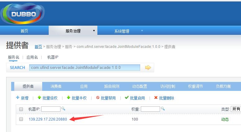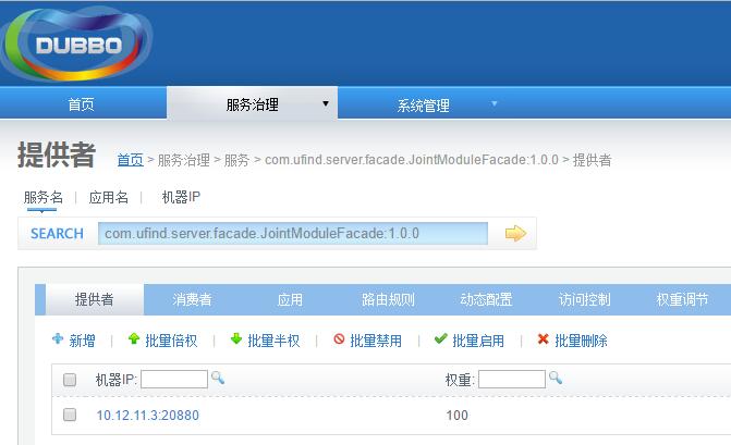 可以看出服务名为:com.ufind.server.facade.JointModuleFacade:1.0.0;