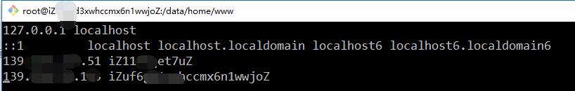 因为,我的这个项目使用的是阿里云的云服务器,有两台,即是上文中的服务器A和服务器B,遇到这个问题之后发现阿里云默认的为我们将内网IP和主机名进行了关联,即是hosts文件的配置: