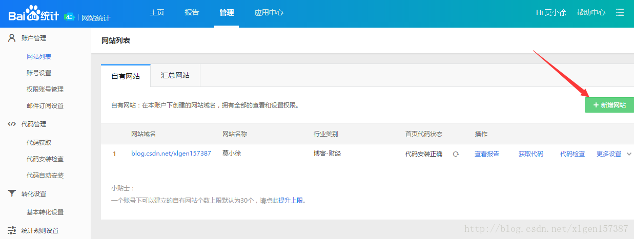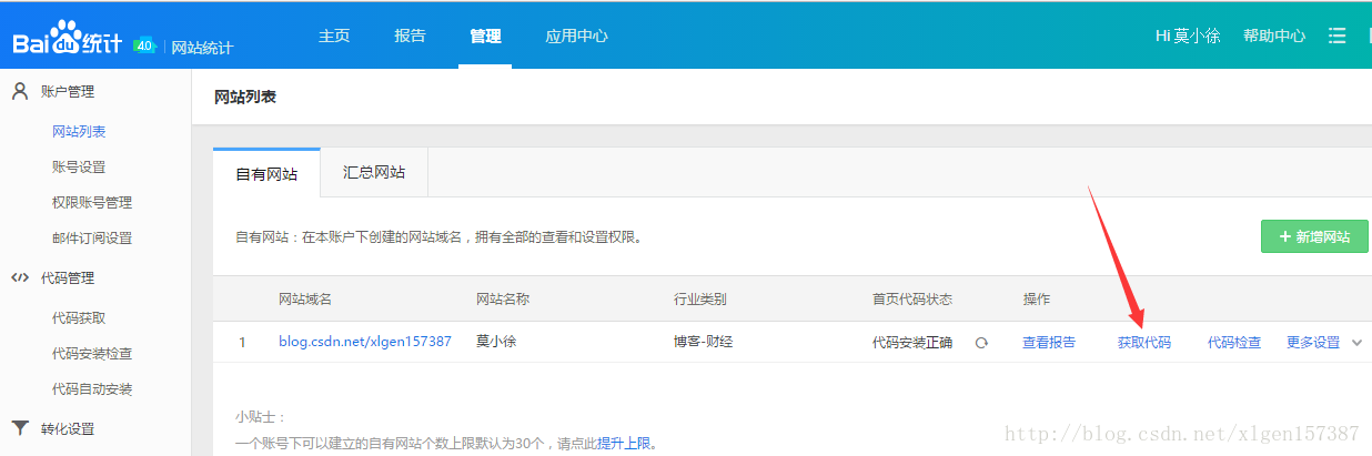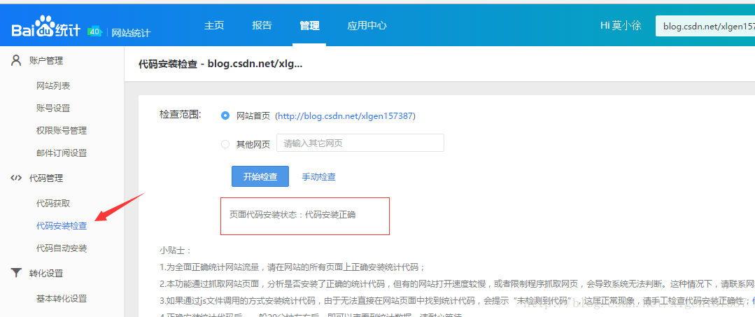 在百度统计管理界面,监测代码是否安装成功,如下: