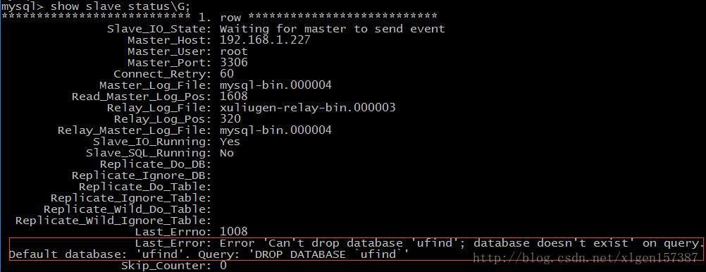 我们,首先从slave库上删除数据库表 ufind,然后到master再次删除该库ufind,该同步就会报错:
