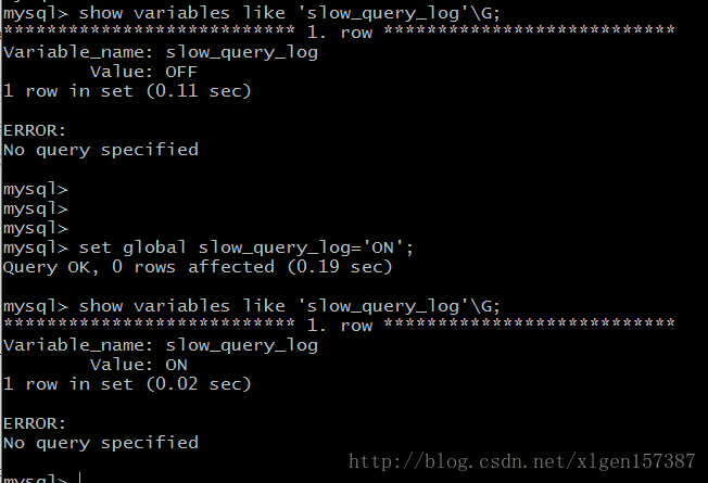 mysql> show variables like 'slow_query_log'\G; 4、开启慢查询日志:
