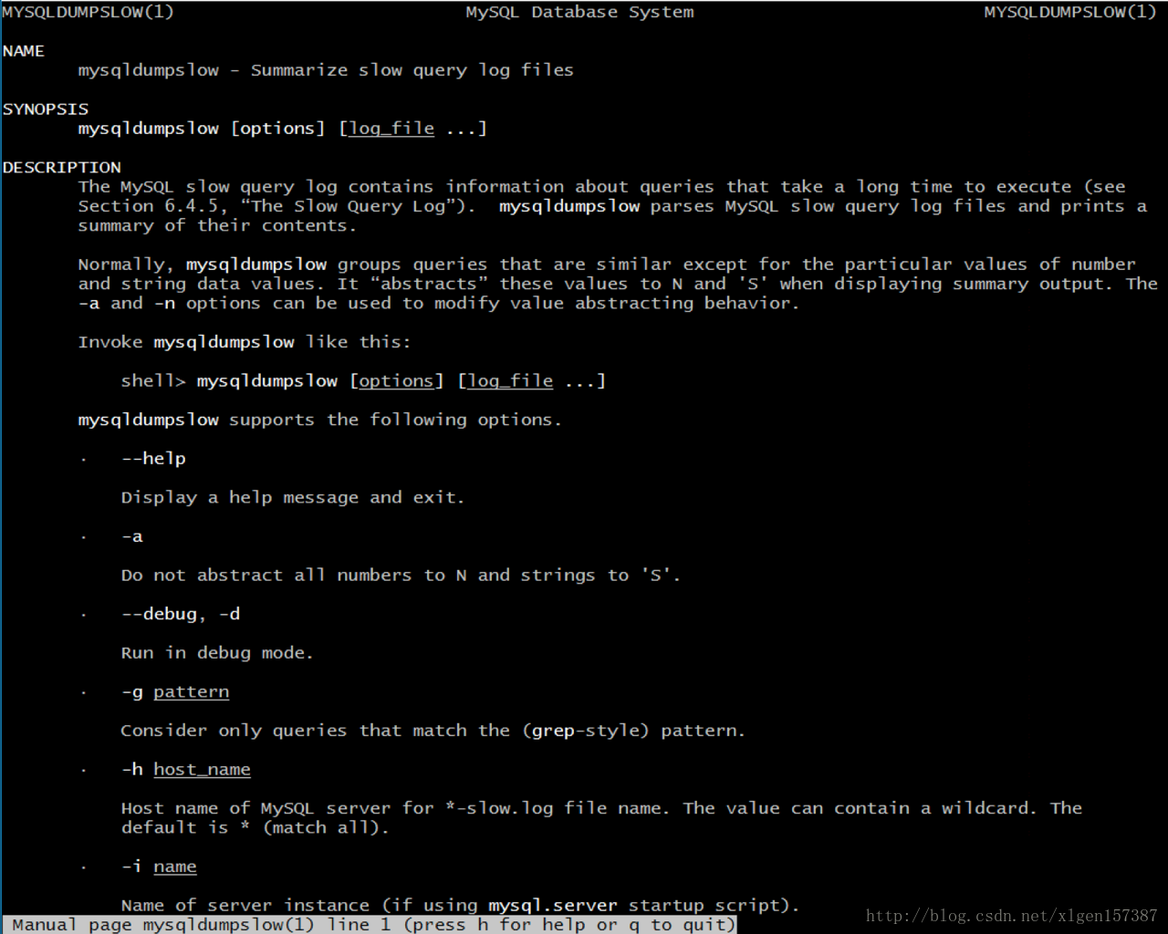 xuliugen@xuliugen:~$ sudo mysqldumpslow /var/lib/mysql/xuliugen-slow.log 关于mysqldumpslow 的更多使用方法,使用man mysqldumpslow 可以进行查看: