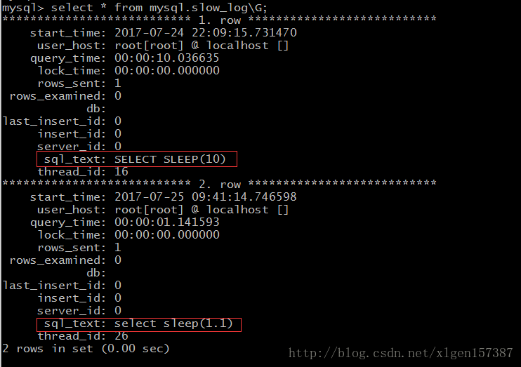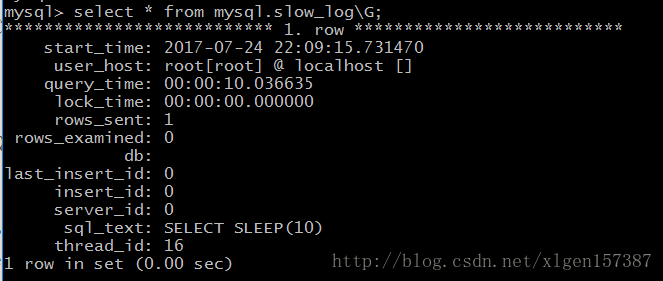 mysql> select sleep(10); 查看慢查询日志: