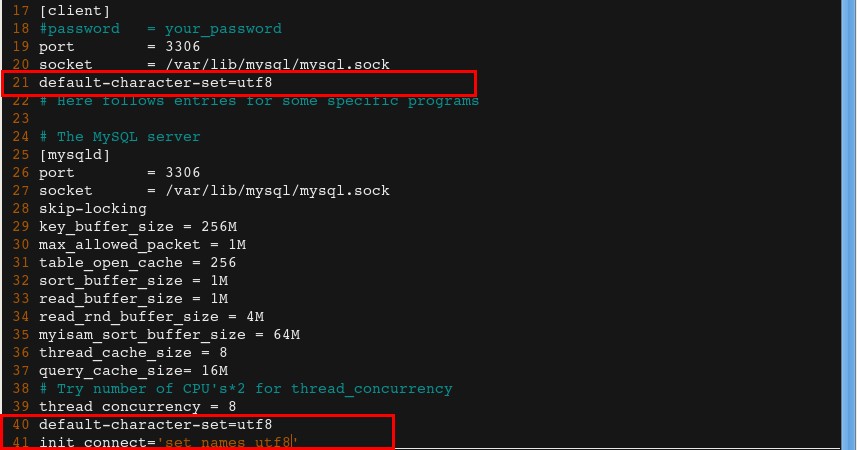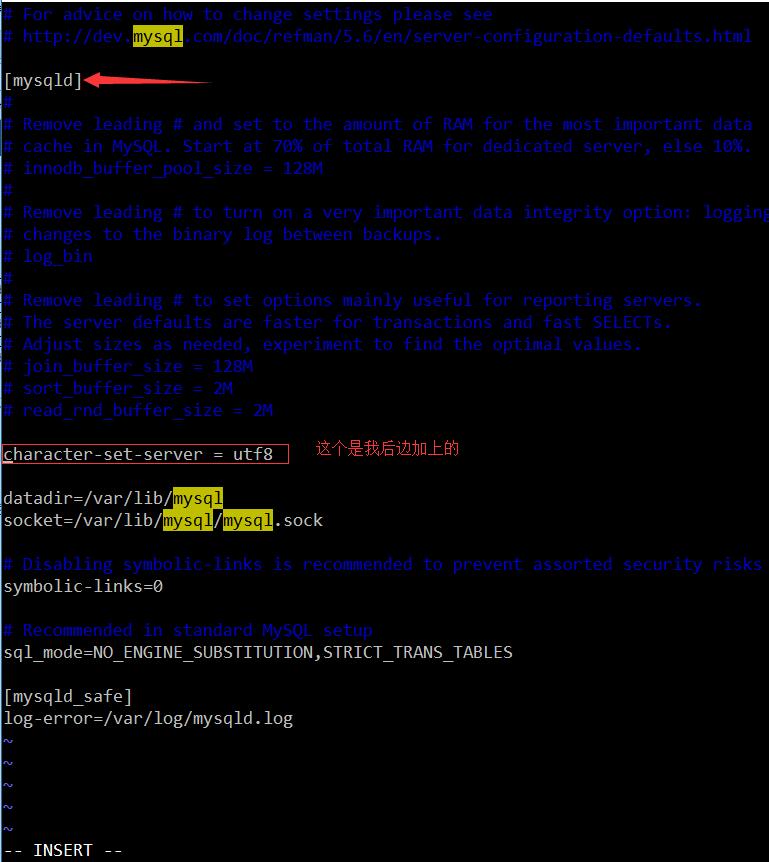 我的这个my.cnf文件只有mysqld 这个section,因此可以直接加上default-character-set=utf8 即可。