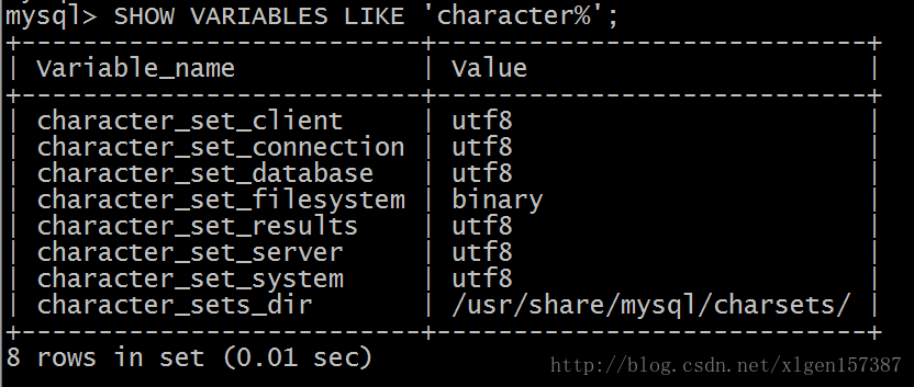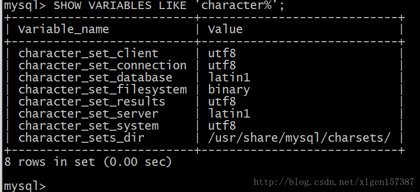 mysql> SHOW VARIABLES LIKE 'character%'; 这是在出现乱码的时候显示的内容,发现很多对应的都是 latin1,我们的目标就是在下次使用此命令时latin1能被UTF8取代。