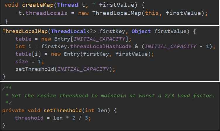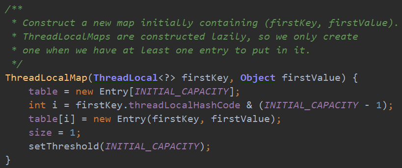 即是调用上述的构造方法进行构造,这里仅仅是初始化了16个元素的引用数组,并没有初始化16个 Entry 对象。而是一个线程中有多少个线程局部对象要保存,那么就初始化多少个 Entry 对象来保存它们。