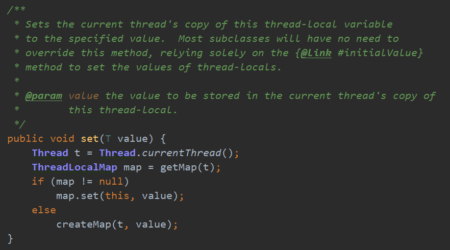 由于每个thread实例都有一个ThreadLocalMap,所以在进行set的时候,首先根据Thread.currentThread()获取当前线程,然后根据当前线程t,调用getMap(t)获取ThreadLocalMap对象,