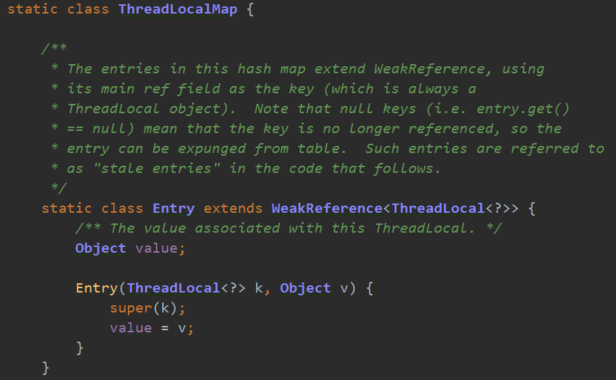 类 Entry 很显然是一个保存map键值对的实体,ThreadLocal<?>为key, 要保存的线程局部变量的值为value。super(k)调用的WeakReference的构造函数,表示将ThreadLocal<?>对象转换成弱引用对象,用做key。