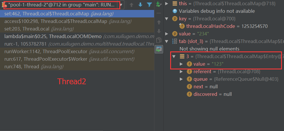然后更改到Thread2,查看,由于多线程,线程1运行到上图情况,线程2运行到下图情况,也可以看出他们是不同的ThreadLocalMap: