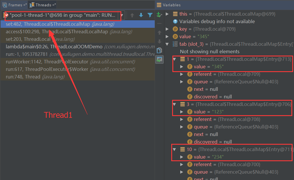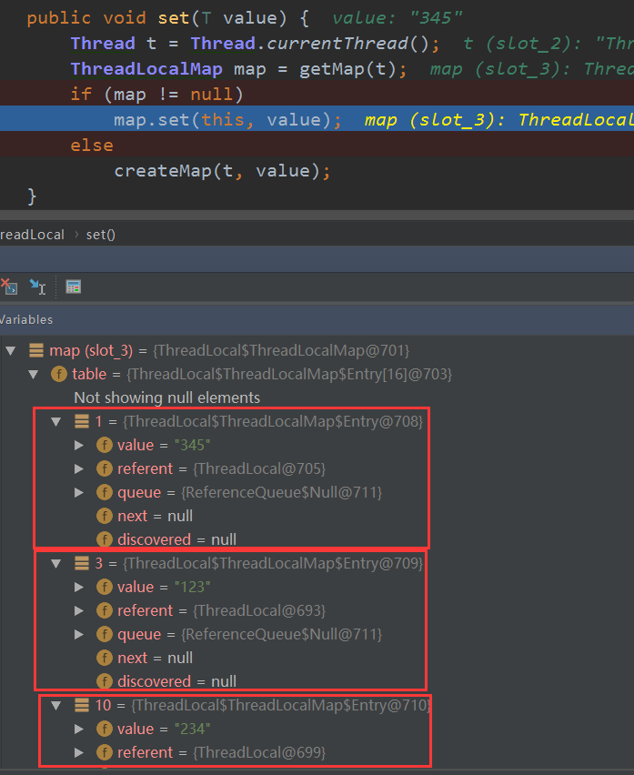 这样的话就相当于一个线程依附了三个ThreadLocal对象,执行完最后一个set方法之后,调试过程如下:
