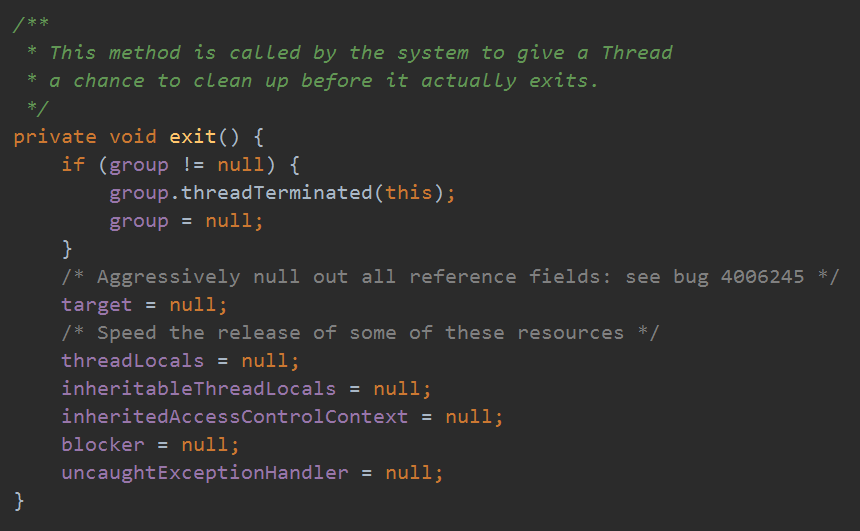 我们知道ThreadLocal变量是维护在Thread内部的,这样的话只要我们的线程不退出,对象的引用就会一直存在。当线程退出时,Thread类会进行一些清理工作,其中就包含ThreadLocalMap,Thread调用exit方法如下: