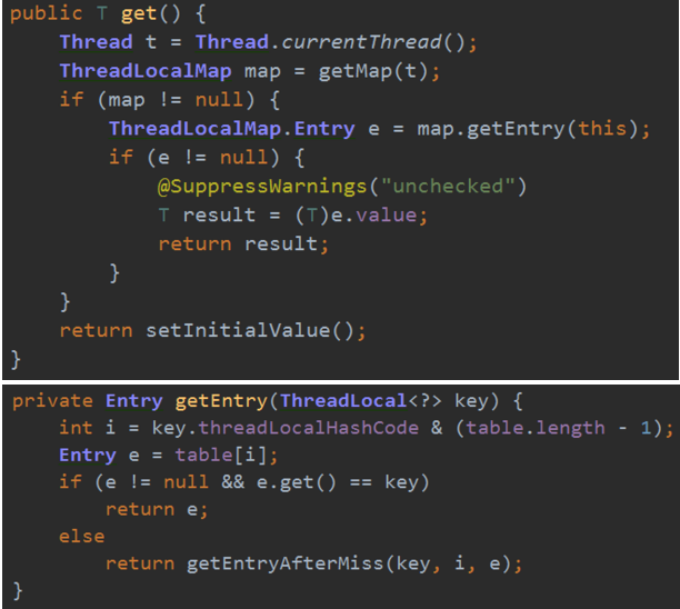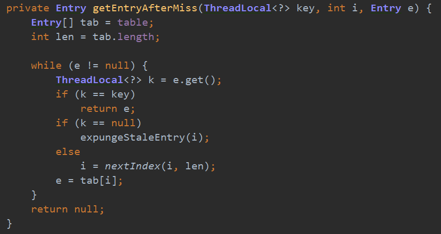 经过上述set方法的分析,对于get方法应该理解起来轻松了许多,首先获取ThreadLocalMap对象,由于ThreadLocalMap使用的当前的ThreadLocal作为key,所以传入的参数为this,然后调用getEntry()方法,通过这个key构造索引,根据索引去table(Entry数组)中去查找线程本地变量,根据下边找到Entry对象,然后判断Entry对象e不为空并且e的引用与传入的key一样则直接返回,如果找不到则调用getEntryAfterMiss()方法。调用getEntryAfterMiss表示直接散列到的位置没找到,那么顺着hash表递增(循环)地往下找,从i开始,一直往下找,直到出现空的槽为止。