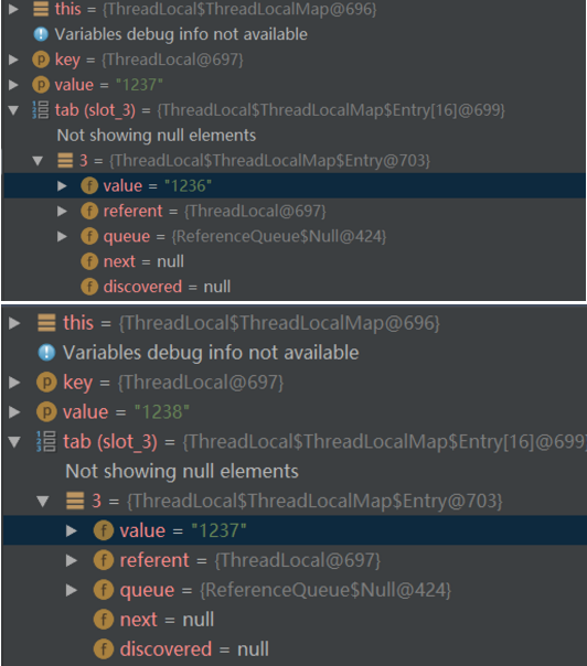 可以看到,在这个线程中的ThreadLocal变量的值始终是只有一个的,即以前的值被覆盖了的!这里是因为Entry对象是以该ThreadLocal变量的引用为key的,所以多次赋值以前的值会被覆盖,特此注意!