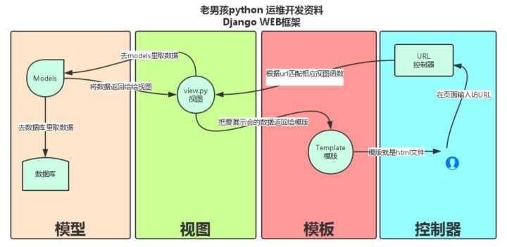 3、Model:若需要数据库操作则View层的View function去Model层(通过ORM建立数据库表、字段与Python对象的对应关系)中取数据,并将数据返回至View function。简单来讲就是处理数据库相关操作(增删改查等)。