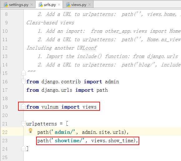 定义URL路由,将/showtime/请求分发至show_time()视图函数进行处理。