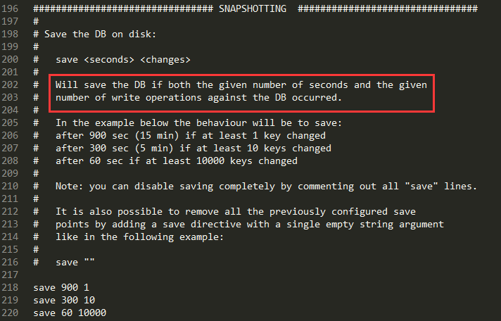 save 60 1000 #60秒时间内有1000次写入操作的时候执行快照的创建