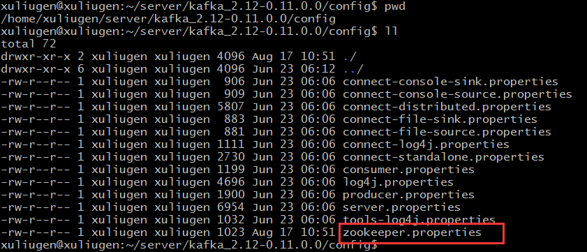 zookeeper的配置文件是在:/kafka_2.12-0.11.0.0/config 目录下