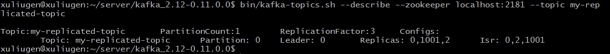>bin/kafka-topics.sh --describe --zookeeper localhost:2181 --topic my-replicated-topic