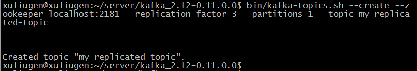 >bin/kafka-topics.sh --create --zookeeper localhost:2181 --replication-factor 3 --partitions 1 --topic my-replicated-topic