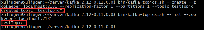 > bin/kafka-topics.sh --create --zookeeper localhost:2181 --replication-factor 1 --partitions 1 --topic testTopic