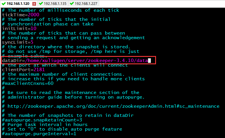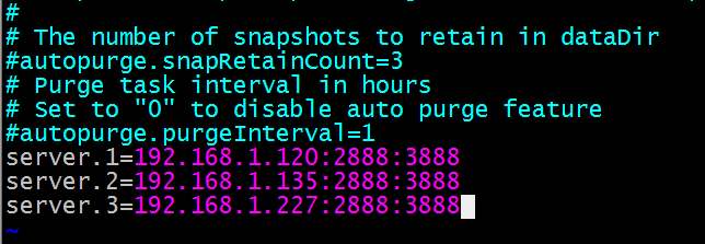 这里的1、2、3是和我们刚才配置的myid的数值是相对应的,即1的IP地址为192.168.1.120,那么server.1=192.168.1.120:2888:3888
