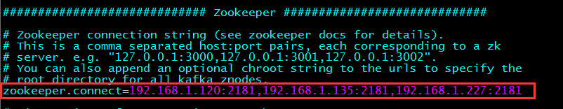 然后修改kafka中使用的Zookeeper集群地址: