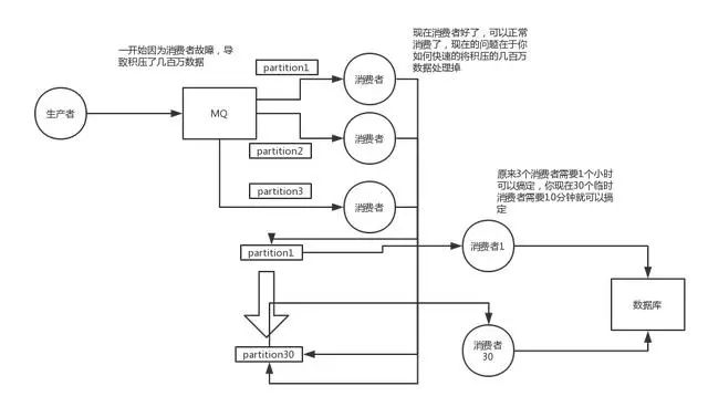 这个是我们真实遇到过的一个场景,确实是线上故障了,这个时候要不然就是修复consumer的问题,让他恢复消费速度,然后傻傻的等待几个小时消费完毕。这个肯定不能在面试的时候说吧。