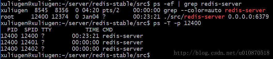 警告1:这里我们一直在强调的单线程,只是在处理我们的网络请求的时候只有一个线程来处理,一个正式的Redis Server运行的时候肯定是不止一个线程的,这里需要大家明确的注意一下!例如Redis进行持久化的时候会以子进程或者子线程的方式执行(具体是子线程还是子进程待读者深入研究);例如我在测试服务器上查看Redis进程,然后找到该进程下的线程: