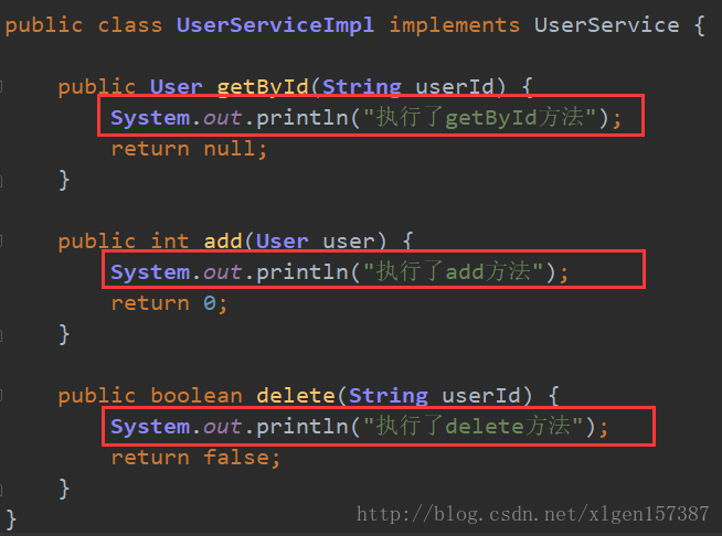 上述为代理类,红色框中圈出的表示以前业务中的模板代码,这里直接输出表示方法执行的过程,以前的UserServiceImpl修改为如下(直接用输出的方式表示方法执行了):