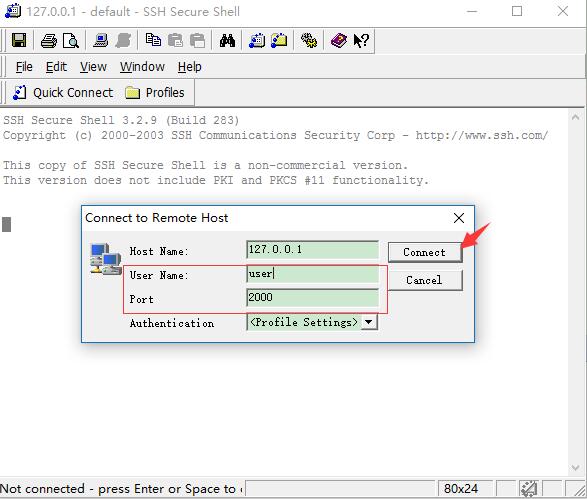 3、使用SecureCRT登录到我们的程序,端口为2000,用户为user: