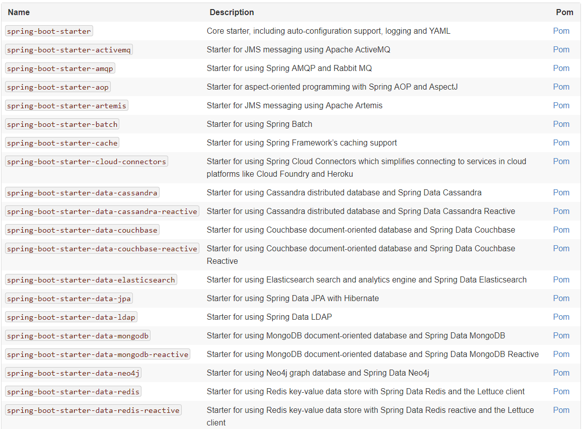 Spring Boot官网还提供了很多的starter pom,请参考:
