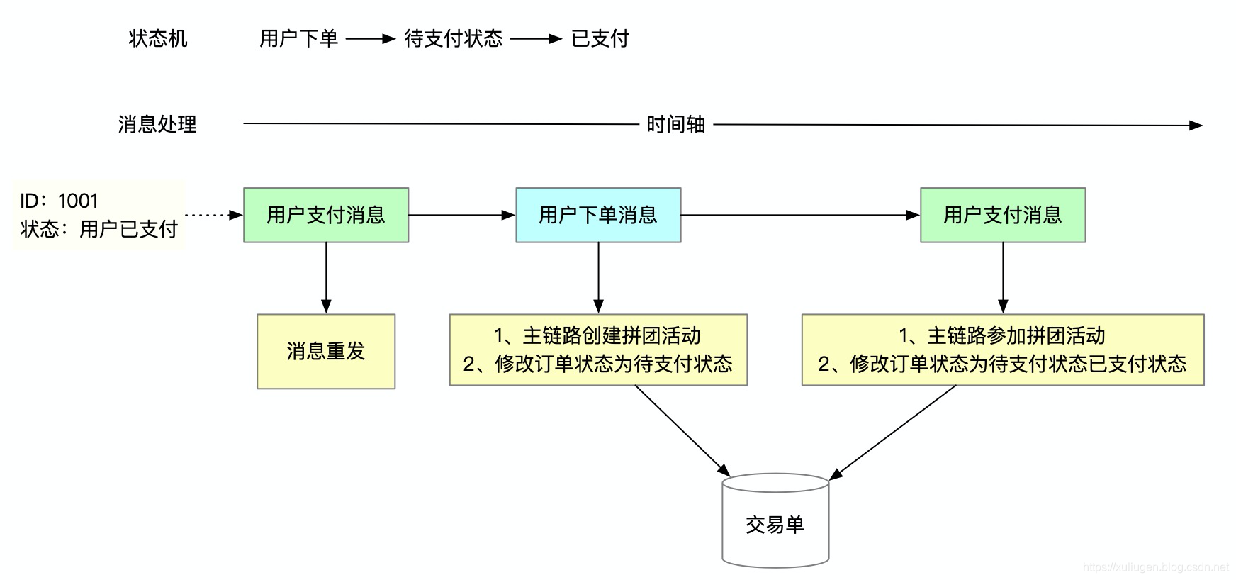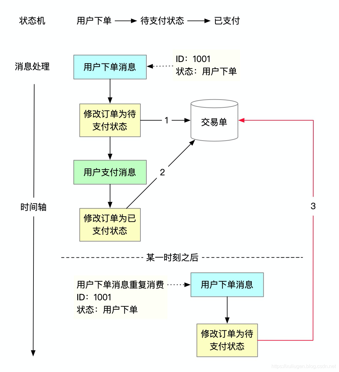 如果出现上述情况,用户下单消息重复消费,在接收到用户支付消息的时候订单状态已经被修改为已支付,但是由于用户下单消息重复消费,消息体是没有变化的(状态没有发生变化),就又修改订单状态为待支付状态了,这里显然是不对的。