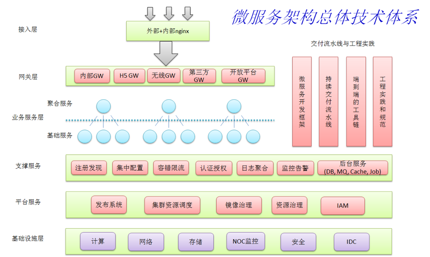 下图是我近期工作总结和参考的一个微服务技术体系,我想同时分享给一线架构师或者工程师参考,其中粉红色标注的模块是和微服务关系最密切的模块,大家在做技术选型时,可以同时对照这个体系。