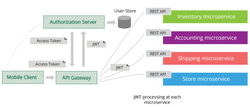 - 每个微服务包含 JWT 客户端,能够解密 JWT 并获取其中的用户会话信息。
