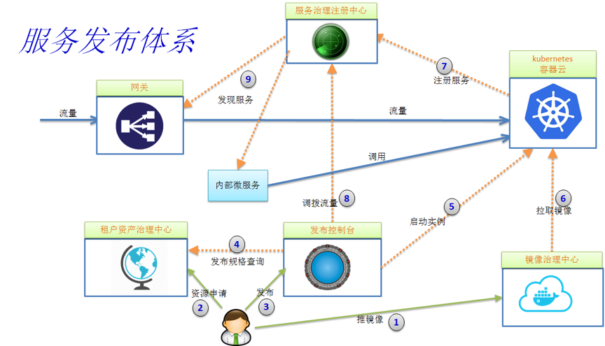 - 用户通过发布系统调用服务注册中心调拨流量,实现蓝绿,金丝雀或灰度发布等机制;