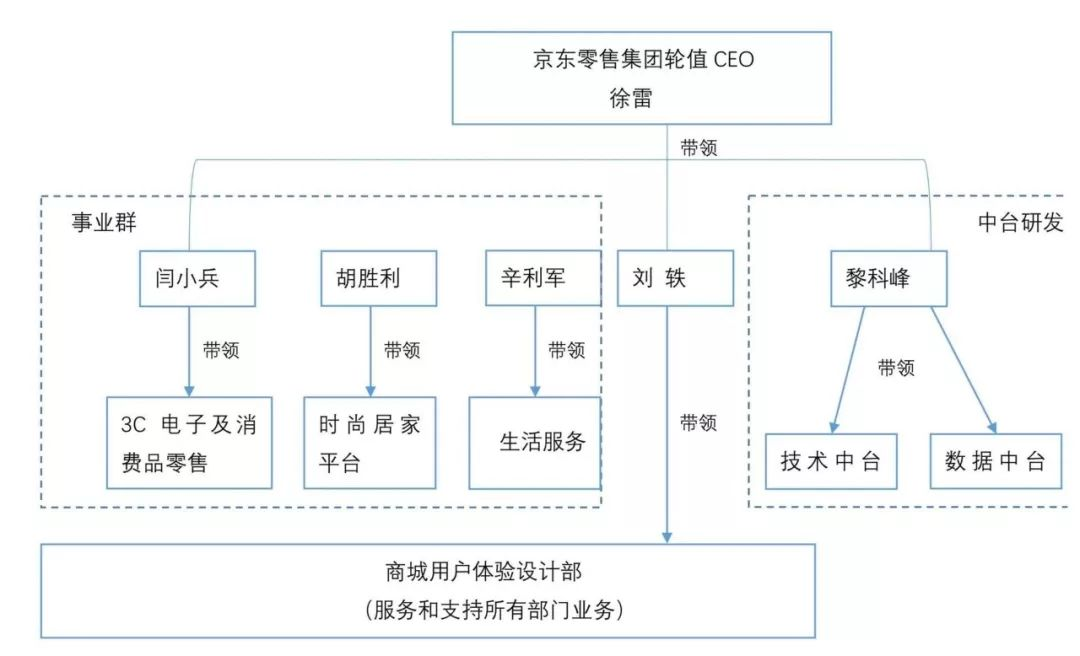 如上文言,阿里推进中台战略的关键人物是行癫,行癫在 2015 年 3 月份开始已经是阿里巴巴中国零售平台负责人;2018 年底,京东商城调整组织架构,中台组织规划(如下图)首次完整亮相,负责人徐雷是京东零售集团的轮值 CEO;2019 年 1 月 4 日,腾讯正式宣布成立技术委员会,腾讯高级执行副总裁、技术工程事业群总裁卢山和腾讯高级执行副总裁、云与智慧产业事业群总裁汤道生两名腾讯总办成员牵头,几大事业群的技术负责人悉数进入技术委员会决策圈,这被评为中台战略的良好开端......