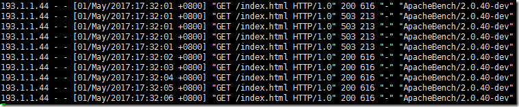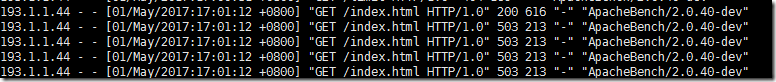 ab -n 5 -c 5 http://10.23.22.239/index.html 得到下面的结果,很明显并发被限制住了,超过阈值的都显示503: