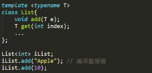 “这里定义了一个模板类List , 通过它你可以实例化成你想要的任何类型,例如List<int>, List<string>,List<Employee>...... 上面的代码实例化了一个List<int>,所以你只能往里边添加整数,如果添加其他类型的值例如字符串, 编译器就能检查出来,直接报错。 我们C++帝国把这种能力称为泛型(Generics) ”
