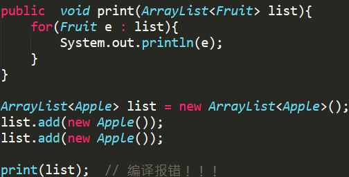 国王觉得很诧异,这是怎么回事,print函数能接受的参数不是ArrayList<Fruit>吗? 当传递一个ArrayList<Apple>为什么出错呢, 难道我们Java帝国的多态不管用了吗?