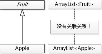 泛型大臣说:“陛下明鉴,这个Apple 虽然是Fruit的子类, 但是 ArrayList<Apple>却不是 ArrayList<Fruit>的子类,实际上他们俩之间是没有关系的,不能做转型操作,所以调用print的时候就报错了。”