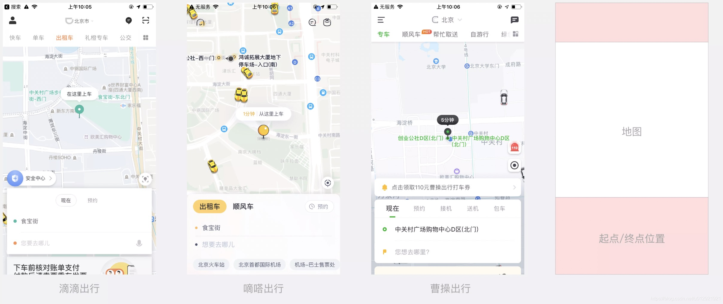 用户使用打车应用时的行为路径主要包括:选择类型-设置地点-设置时间-等待应答 几个主要节点。这些节点流程可以通过页面的内容布局直观看到,只要的节点内容都在首页强化露出;无论是老牌的滴滴,还是刚刚进入市场不久的其他应用,在首页的设计上都遵循了用户的使用习惯。
