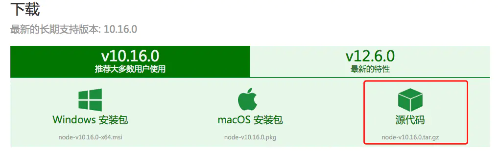 先进入nodejs下载网址http://nodejs.cn/download/,如下图所示,点击“源代码”进行下载。